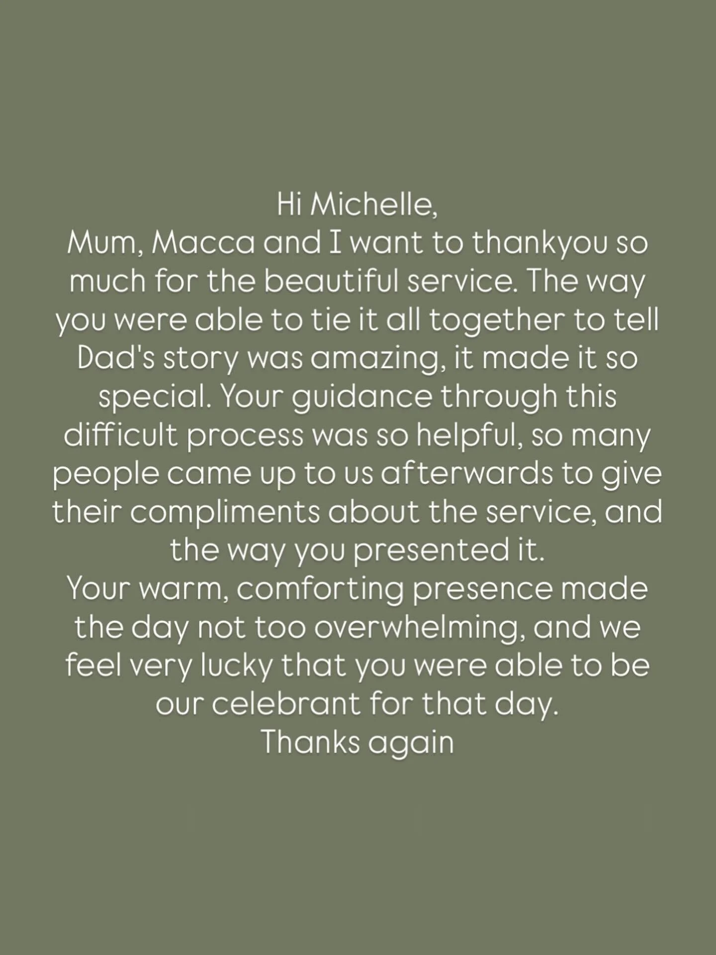 I work closely with my families to ensure every farewell feels personal and meaningful. Whether you’re planning a funeral, a memorial, a life celebration - big or small - I’d love to be able to help you create a ceremony that truly reflects your loved one.